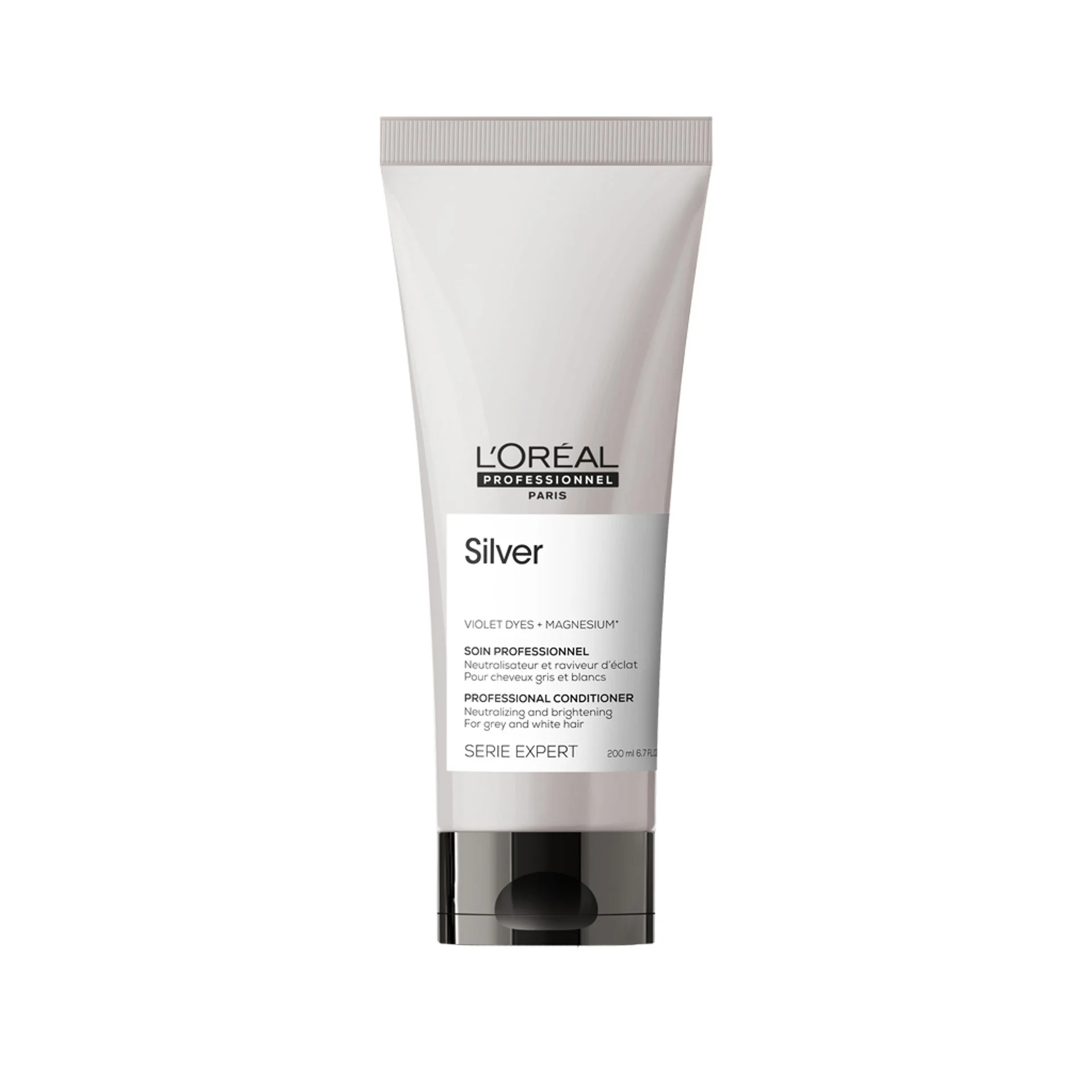 Moisturise your white hair. L’Oréal Professionnel Silver Conditioner illuminates and hydrates white and grey hair. Thanks to its violet pigments, this conditioner eliminates the yellow tones of white hair, which makes it look beautiful and shiny.